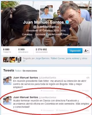 El presidente de Colombia, Juan Manuel Santos, ha anunciado este viernes desde Davos (Suiza) que este semestre Facebook abrirá una oficina en Colombia.