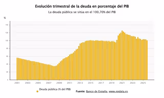La deuda pública cierra 2025 en el 100,7% del PIB, tras caer un punto, y mejora el objetivo del Gobierno