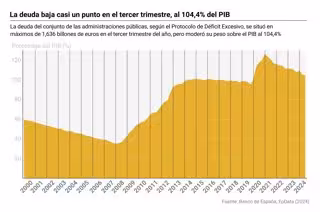 En el último año la deuda pública se ha incrementado en 57.304 millones de euros, lo que representa un repunte del 3,6%, aunque su peso en el PIB ha caído tres puntos, del 107,4% en el tercer trimestre de 2023 al 104,4% entre julio y septiembre de este año, dado el mayor impulso de la actividad económica.