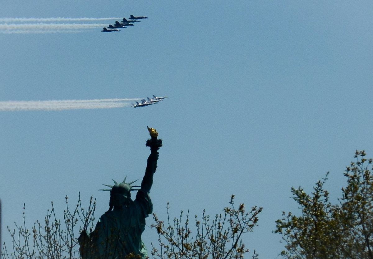Archivo - 28 April 2020, US, New York: Demonstration squadrons of the US Air Force Thunderbirds and US Navy Blue Angels fly over the Statue of Liberty in New York to honor healthcare workers on the front line of the battle against the Coronavirus (COVID-1