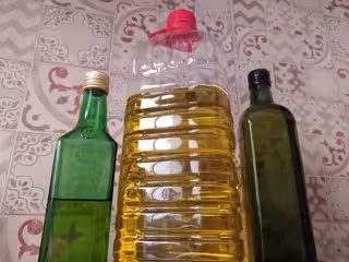 Aceite de oliva envasado en garrafa de plático y botellas de vídrio.