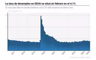 Gráfico con evolución de la tasa de paro en Estados Unidos. La economía estadounidense generó 151.000 nuevos puestos de trabajo no agrícolas durante el pasado mes de febrero, una cifra superior a los 125.000 creados en enero, mientras que la tasa de paro