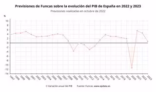 Desde la Fundación estiman que en el último trimestre de este año y el primer del año que viene "es posible" que se produzcan decrecimientos del Producto Interior Bruto (PIB), lo que generaría una situación de 'recesión técnica'. Eso sí, desde Funcas han destacado que en un horizonte más largo se producirá este "pequeño" crecimiento positivo en España (0,7%), frente a unas perspectivas menos halagüeñas para otras economías de la zona euro.