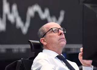 Archivo - 08 April 2025, Hesse, Frankfurt/Main: A trader sits on the trading floor of the Frankfurt Stock Exchange in front of the display board showing the Dax curve. US President Trump's aggressive US tariff policy can also be seen as a trade war agains