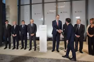 Los reyes Felipe VI y Letizia; el presidente de la Generalitat, Pere Aragons; el ministro de Industria, Jordi Hereu, y la alcaldesa de L'Hospitalet de Llobregat (Barcelona), Núria Marín, han inaugurado este miércoles la segunda Torre Puig, del grupo de moda y perfumería Puig.