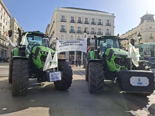 Las principales organizaciones de productores del sector primario de la Comunidad de Madrid han congregado este miércoles a decenas de personas en la céntrica Puerta del Sol para protestar por las condiciones del acuerdo comercial entre la Unión Europea y Mercosur, así como por las políticas agrarias a nivel nacional.