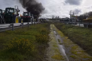 Agricultores y ganaderos cortan la A-52 con tractores y rollos de paja, a 10 de enero de 2026, en Xinzo de Limia, Orense, Galicia (España). El corte, que afecta a los dos carriles de circulación de la autovía durante varios kilómetros, es una protesta de - Rosa Veiga - Europa Press