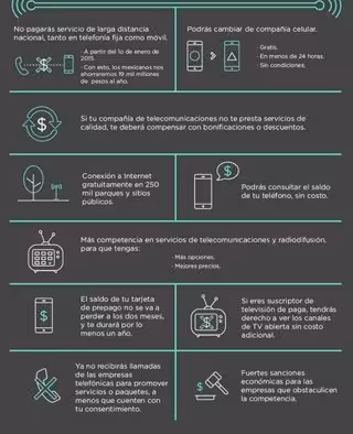 -- A partir del 1º de enero de 2015, no se pagará servicio de larga distancia nacional, tanto en telefonía fija como móvil. Con esto, los mexicanos ahorrarán 19.000 millones de pesos al año.