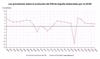 Según las nuevas proyecciones, contenidas en su informe 'Perspectivas Económicas', el PIB español crecerá este año un 2,3%, considerablemente por debajo del 5,8% registrado en 2022, pero dos décimas por encima de la previsión de la OCDE para España publicada el pasado mes de junio y de la previsión del Gobierno (2,1%), mientras que, de cara a 2024, la organización no ha modificado su pronóstico y sigue esperando que la economía española crezca un 1,9%.