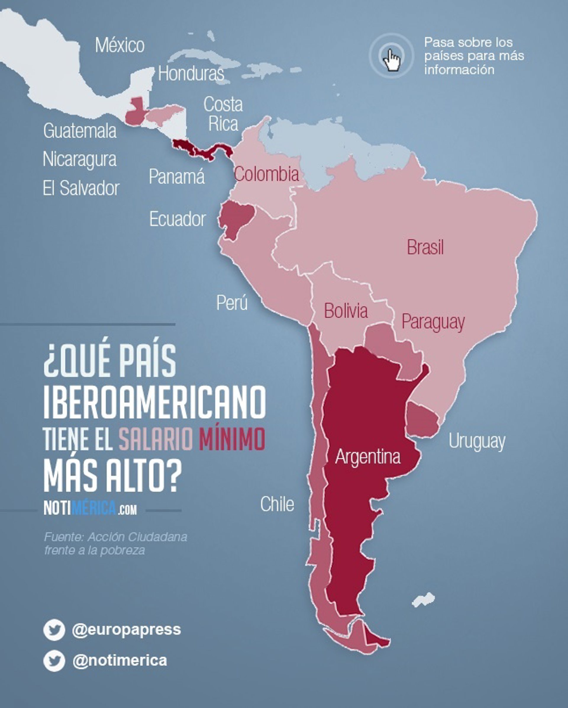Así, según el documento, Costa Rica es el país con un salario mínimo más alto: 534 dólares al mes. A este le siguen Panamá (500 dólares) y Argentina (467,1 dólares).