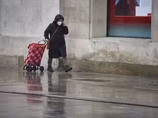 Una mujer con mascarilla camina bajo la lluvia con el carro de la compra durante el Martes Santo - Eduardo Sanz - Europa Press