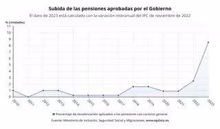 Las pensiones contributivas subirán en 2023 en torno a un 8,5% con la fórmula de revalorización recogida en la ley de reforma de las pensiones en la que se tiene en cuenta, como referencia para determinar la subida de estas prestaciones, el IPC interanual promedio de doce meses (de diciembre del año anterior a noviembre del ejercicio en vigor).