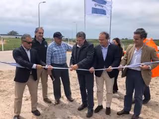 El ministro de Transporte y Obras Públicas de Uruguay, Víctor Rossi; los consejeros delegados de Sacyr Ingeniería e Infraestructuras y Sacyr Concesiones, Pedro Sigüenza y Rafael Gómez del Río; el director de Grupo Saceem, Alejandro Ruibal, y otras autoridades locales inauguraron este jueves los trabajos realizados en el desvío de la ciudad de Nueva Palmira.