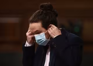 El secretario general de Podemos y vicepresidente segundo del Gobierno, Pablo Iglesias, se coloca la mascarilla durante una sesión de Control al Gobierno celebrada en el Congreso de los Diputados, en Madrid, (España), a 17 de febrero de 2021. El pleno, - EUROPA PRESS/E. Parra. POOL - Europa Press