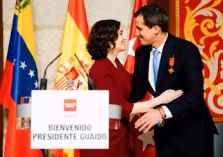 La presidenta de la Comunidad de Madrid, Isabel Díaz Ayuso, ha ofrecido hoy una recepción oficial al presidente encargado de Venezuela, Juan Guaidó, en la Real Casa de Correos, sede del Gobierno regional, donde le ha impuesto la primera Medalla Internacional de la Comunidad de Madrid, algo que ha tildado de momento "histórico para la libertad" frente a la "tiranía".