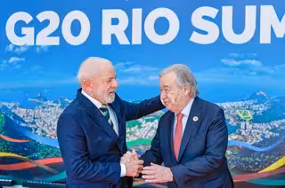 HANDOUT - 18 November 2024, Brazil, Rio De Janeiro: Brazil's President Luiz Inacio Lula da Silva (L) welcomes United Nations' Secretary General Antonio Guterres to the G20 summit. Photo: Ricardo Stuckert/G20/dpa - ATTENTION: editorial use only and only - Ricardo Stuckert/G20/dpa