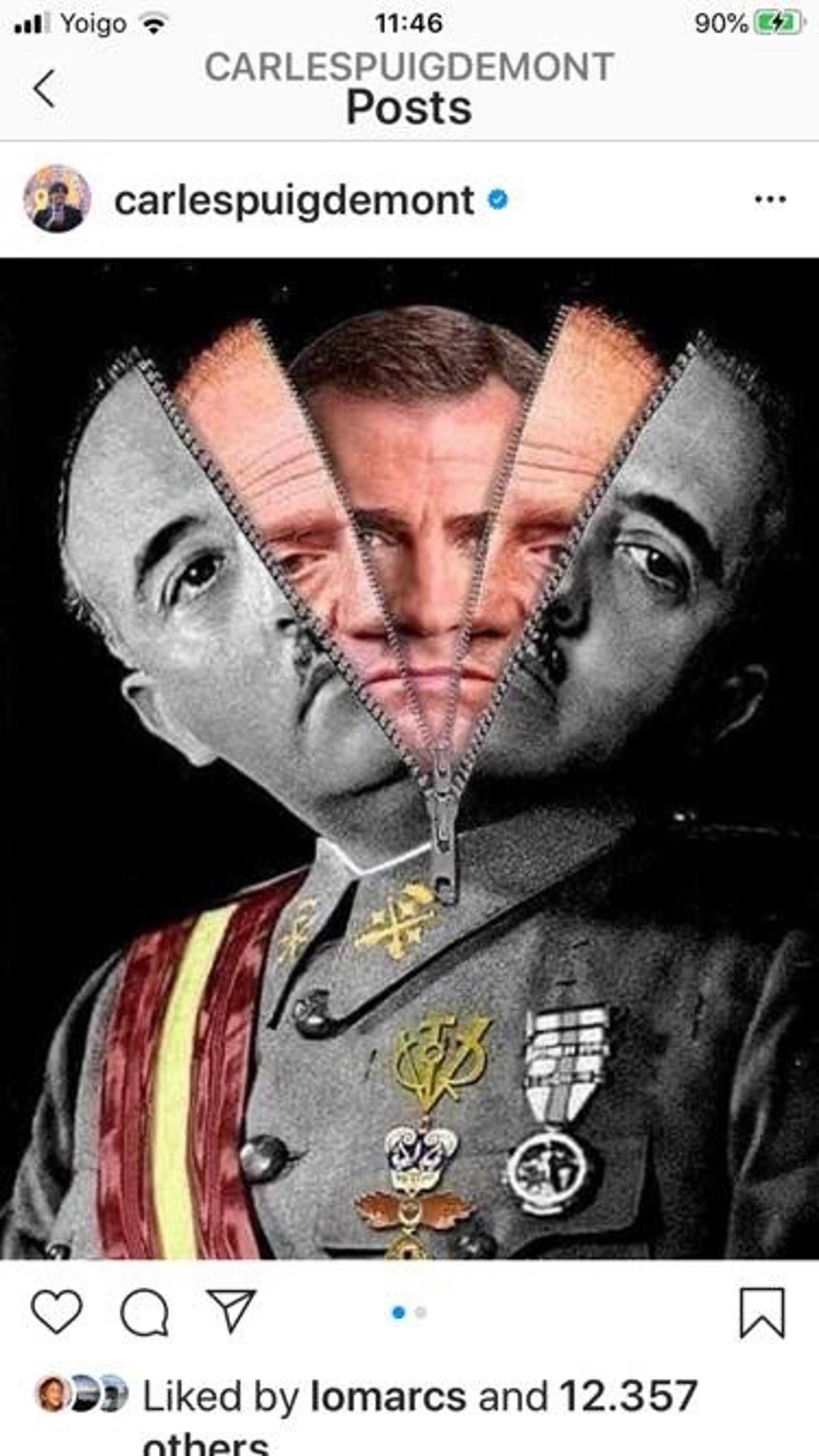 "Estos son los fragmentos de las resoluciones votadas y aprobadas por el pleno del Parlament que se han censurado", ha destacado Puigdemont, acompañando sus palabras de los citados textos, y de una imagen en la que se ve el cuerpo del dictador Francisco Franco, cuya cara se divide por la mitad junto con la del rey emérito y la de Felipe VI.