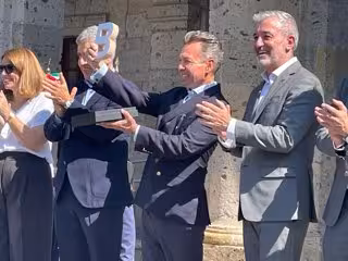 Lemos y Collboni se han intercambiado regalos: Lemos ha entregado al alcalde una reproducción de los murales de José Clemente Orozco en el Museo Cabañas y Collboni ha regalado al gobernador una B de la ciudad catalana.
