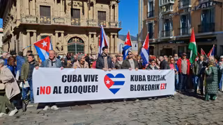La movilización ha sido convocada por la plataforma Hegoak y ha tenido lugar a las 11.30 horas en la plaza Consistorial, donde se ha desplegado una pancarta con el lema 'Cuba libre. No al bloqueo'. Se han lucido varias banderas de Cuba y también alguna de Palestina.