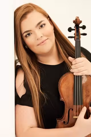 Ellinor D'Melon toca un violín de Giovanni Baptista Guadagnini de 1743 gracias a un amable préstamo de un donante anónimo de Londres.