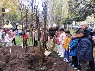 Los niños y niñas de 1 y 2 curso de Primaria del CEIP Vuelo Madrid Manila, el alcalde de Logroño, el concejal de Medio Ambiente y el director de Concéntrico han sido protagonistas de la plantación de árboles.