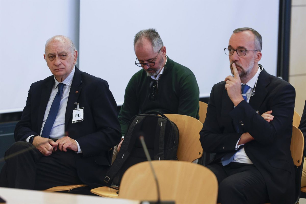 El exministro del Interior Jorge Fernández Díaz y su número dos, Francisco Martínez, durante el primer día del juicio de la Operación Kitchen, en la Audiencia Nacional, a 6 de abril de 2026, en San Fernando de Henares, Madrid (España). - Pool