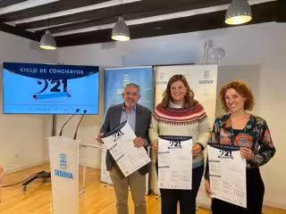 La alcaldesa de Segovia, Clara Martín, junto con el vicepresidente y diputado de Cultura de la Diputación Provincial, José María Bravo, y la coordinadora de la Fundación Don Juan de Borbón, Noelia Gómez, han presentado este jueves esta programación.