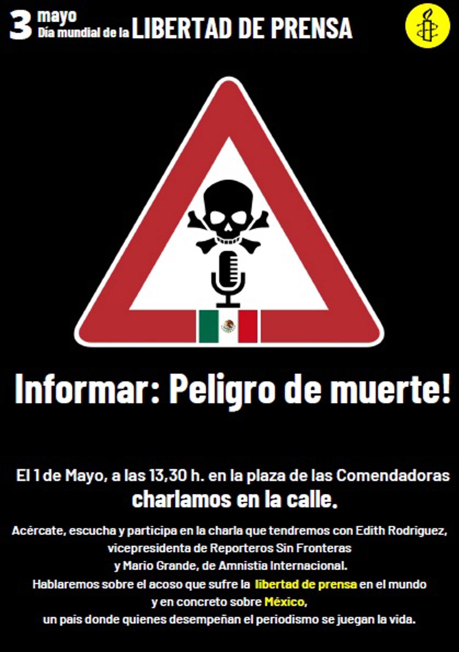 Amnistía Internacional Madrid celebrará el domingo una charla abierta con motivo del Día Mundial por la Libertad de Prensa, 3 de mayo, para abordar el acoso que sufren los periodistas en todo el mundo y especialmente en México, donde en 2021 fueron asesinados 22 periodistas y 7 en lo que va de 2022.