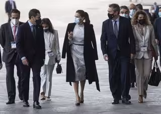 La Reina Doña Letizia (c) a su llegada a la inauguración la primera edición del congreso Tourism Innovation Summit (TIS 2020) acompañada por el presidente de la Junta, Juanma Moreno (i); el alcalde de Sevilla, Juan Espadas. En Sevilla (Andalucía, España - María José López - Europa Press