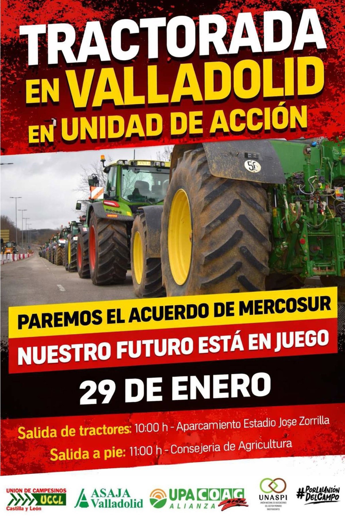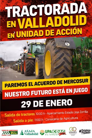 La tractorada de Valladolid está secundada por Asaja, UPA, COAG, UCCL y la Unión Nacional de Asociaciones del Sector Primario Independientes (Unaspi) bajo el hashtag 'Por la unidad del campo' y el lema 'Paremos el acuerdo de Mercosur. Nuestro futuro está en juego'.