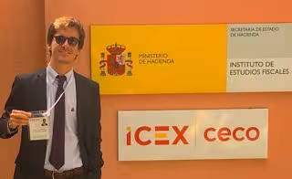 Beñat Altarriba García junto a la entrada del Instituto de Comercio Exterior (ICEX) .
