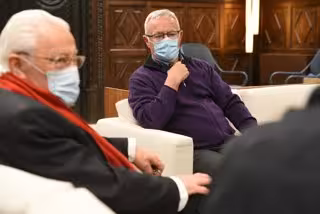 El alcalde de Valencia, Joan Ribó (d), y el fundador de la Asociación Mensajeros de la Paz, Padre Ángel (i), durante la inauguración del acto 'Higienebus' en el Ayuntamiento de Valencia, a 21 de febrero de 2022, en Valencia, Comunidad Valenciana (España - Jorge Gil - Europa Press