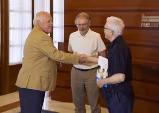 El presidente del Parlamento de Andalucía, Jesús Aguirre, se ha reunido este martes con el fundador y coordinador de la Asociación Paz y Bien, Fray Rafael Pozo, que le ha presentado la Memoria de actividad de la ONG correspondiente al año 2022 sobre su intervención en Guatemala.