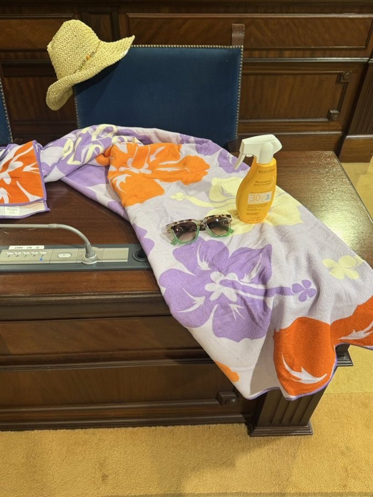 Una toalla de playa sobre el escaño de la presidenta del Govern, Marga Prohens. - PSIB