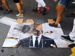 Varios encapuchados han quemado una foto del Rey Felipe VI, otra del presidente de Francia, Emmanuel Macron, y una bandera europea durante la manifestación de la Izquierda Independentista por la Diada.