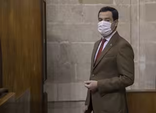 El presidente de la Junta de Andalucía, Juanma Moreno, minutos antes del inicio de la sesión de control al gobierno con preguntas al presidente de la Junta en la primera jornada del Pleno del Parlamento andaluz. En Sevilla (Andalucía, España) , a 16 de