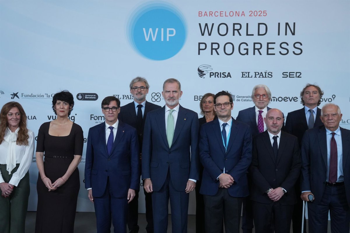 El Rey Felipe VI (4i) y el presidente de la Generalitat, Salvador Illa (3i), a su llegada a la segunda jornada del foro 'World in Progress', en el Palau de Congressos de Catalunya, a 21 de octubre de 2025, en Barcelona, Catalunya (España). Prisa organiza - David Zorrakino - Europa Press