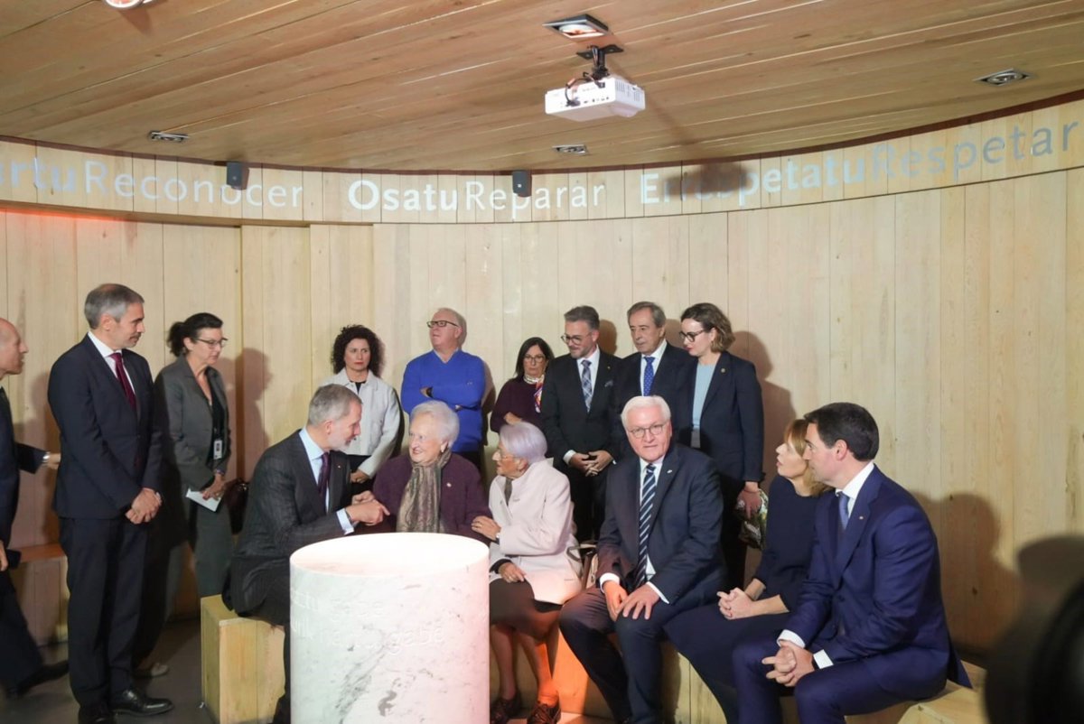 El presidente de la República Federal de Alemania, Frank-Walter Steinmeier, y la primera dama alemana, Elke Bünderbender, acompañados por el Rey Felipe VI y el Lehendakari, Imanol Pradales, se han reunido este viernes en la 'Sala de la Reconciliación' del Museo de la Paz de Gernika con Crucita Etxabe y María del Carmen Aguirre, nonagenarias supervivientes del bombardeo, que eran pequeñas cuando en 1937 las bombas de la aviación nazi, en apoyo a la tropas franquistas en la Guerra Civil, arrasaron el municipio.