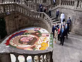 Don Felipe y Doña Letizia, que lucía un favorecedor vestido camisero de inspiración vegetal firmado por Pedro del Hierro, han llegado acompañados de la vicepresidenta tercera del Gobierno, Nadia Calviño, y se han detenido a contemplar a la entrada del templo las dos alfombras florales con las que se ha engalanado el atrio, una en la que se podía ver al Apóstol Santiago y otra en la que aparecían algunos de los instrumentos musicales del Pórtico de la Gloria.