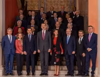 Acto seguido ha tenido lugar la foto oficial en el interior de la sede de la fundación. Sus Majestades se han situado en primera línea, mientras que a la derecha del Rey Felipe VI se encontraba el presidente de la Junta de Andalucía y a la izquierda de la Reina Letizia el director de la RAE y presidente de Asale, Santiago Muñoz Machado.