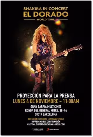 Shakira protagoniza el largometraje 'Shakira en concierto: El Dorado World Tour', que se estrenará el 13 de noviembre en los cines españoles y se exhibirá solo por una noche, como han anunciado los organizadores en la presentación de la pieza este lunes.