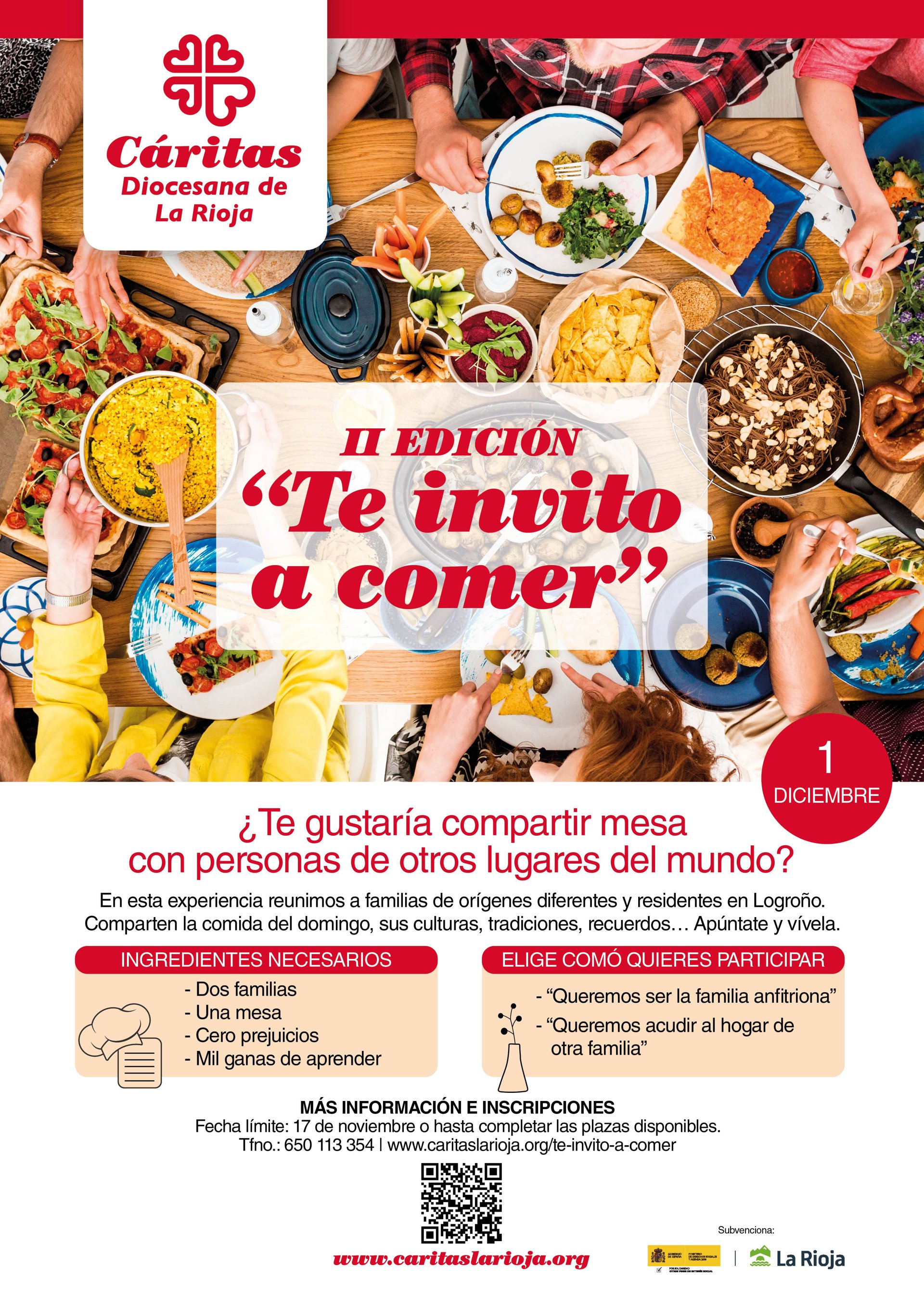 Este próximo domingo, 18 unidades familiares originarias de Colombia, Marruecos, Brasil, Rumanía, El Salvador, Inglaterra y España compartirán platos típicos, tradiciones y vivencias en el proyecto de Cáritas La Rioja 'Te invito a comer'.