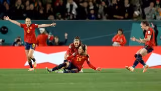 Olga Carmona (centre) of Spain celebrates her match winning goal during the FIFA Women's World Cup 2023 Semi Final soccer match between Spain and Sweden in Auckland, New Zealand, Tuesday, August 15, 2023. (AAP Image/Brett Phibbs) NO ARCHIVING, EDITORIAL