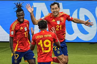 Archivo - 14 July 2024, Berlin: Spain's Mikel Oyarzabal celebrates scoring his side's second goal with teammates Nico Williams and Lamine Yamal during the UEFA Euro 2024 final soccer match between Spain and England at the Olympic Stadium. Photo: Michael K - Michael Kappeler/dpa - Archivo