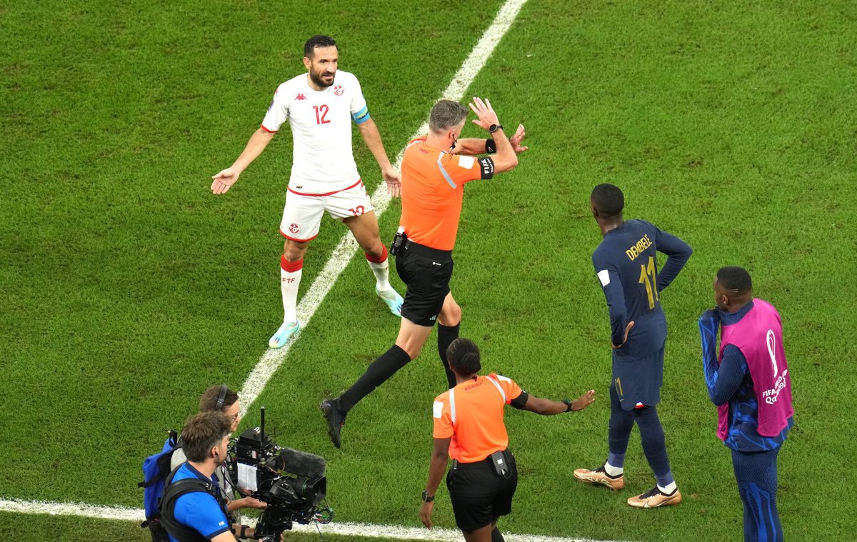 30 November 2022, Qatar, Al Rayyan: New Zealand referee Matthew Conger (L) gives his decision after ruling out France's Antoine Griezmann goal during the FIFA World Cup Group D soccer match between Tunisia and France at the Education City Stadium. Photo