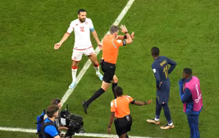 30 November 2022, Qatar, Al Rayyan: New Zealand referee Matthew Conger (L) gives his decision after ruling out France's Antoine Griezmann goal during the FIFA World Cup Group D soccer match between Tunisia and France at the Education City Stadium. Photo - Jonathan Brady/PA Wire/dpa