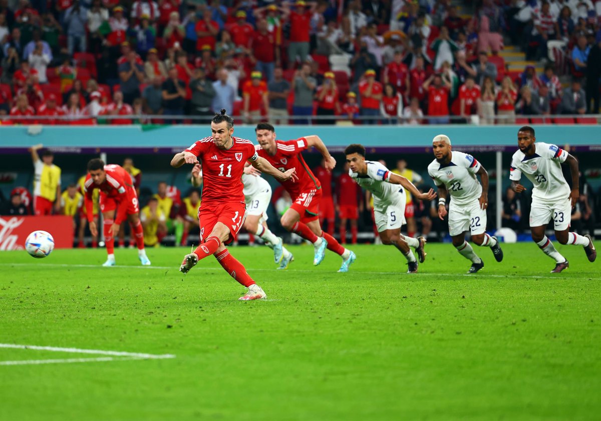 21 November 2022, Qatar, Al Rayyan: Wales' Gareth Bale scores his side's first goal from the penalty spot during the FIFA World Cup Qatar 2022 Group B soccer match between USA and Wales at Al Rayyan Stadium. Photo: Tom Weller/dpa - Tom Weller/dpa
