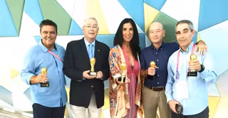 Joaquín Maroto, Juan Antonio Prieto, Cristina Cubero, Orfeo Suárez y José Antonio Pascual recogen el reconocimiento de la AIPS por haber cubierto ocho o más Copas del Mundo de fútbol.