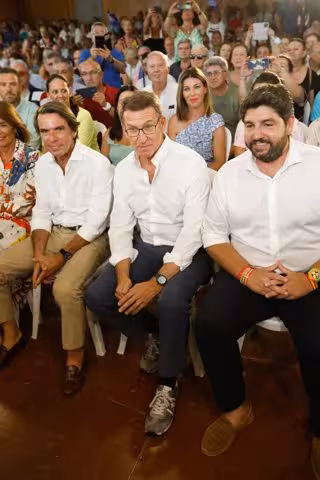 En su discurso, Aznar también ha elogiado a López Miras, un "gran presidente de Murcia". "Vas a seguir siendo el presidente de Murcia", le ha espetado. Previamente, el presidente de Murcia en funciones ha pedido una "mayoría contundente" para Feijóo, de forma que pueda haber un Gobierno "solitario, firme, sólido y sin ataduras y sin ambages", ya que, según ha dicho, "lo que está pasando en Murcia puede pasar en España".