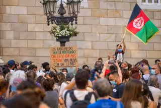 Varias personas participan en una concentración en solidaridad con las mujeres y niñas afganas en la plaza de Sant Jaume de Barcelona, a 18 de agosto de 2021, en Barcelona, Cataluña (España). La protesta ha sido convocada por el espacio feminista Ca la - Lorena Sopna - Europa Press